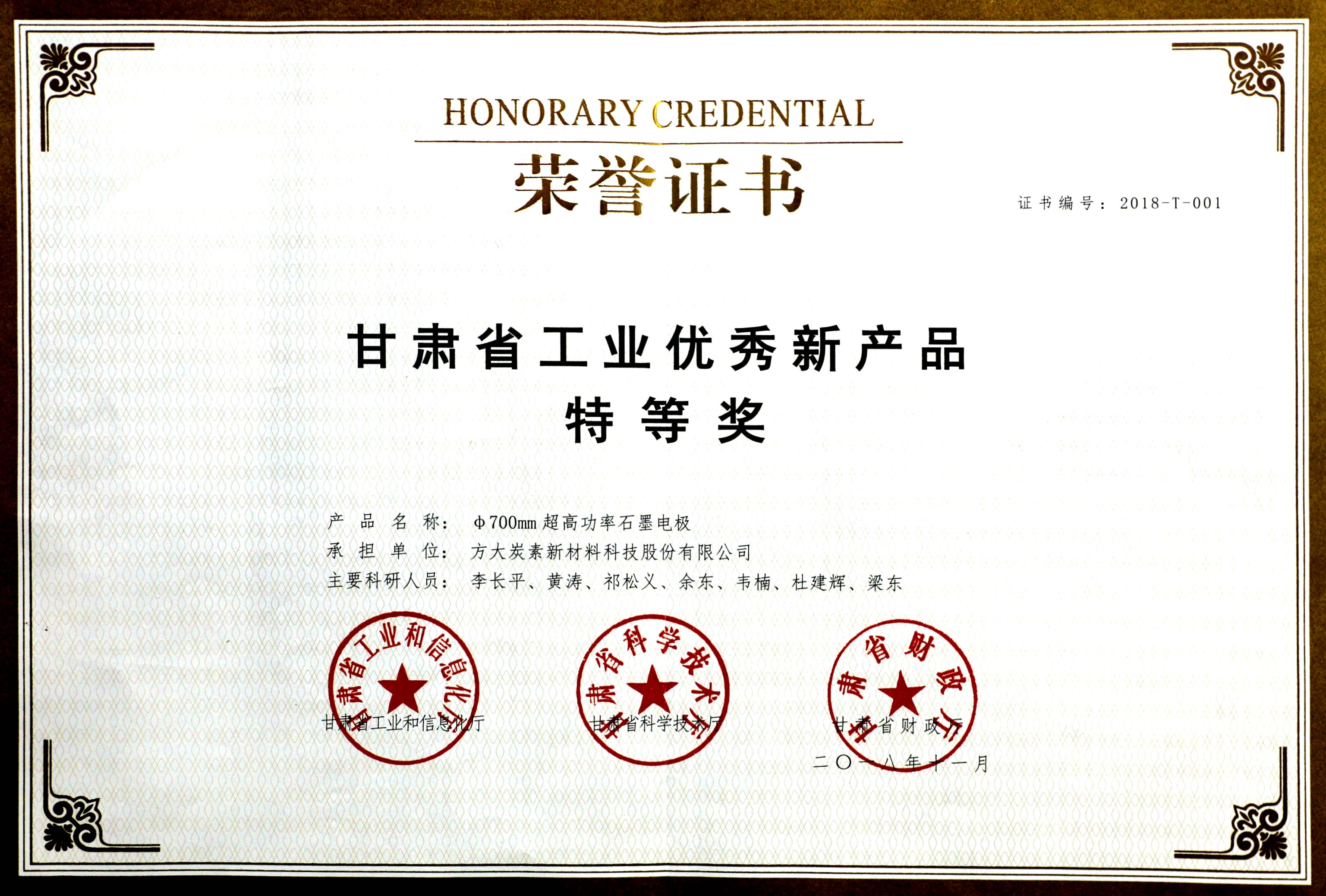 甘肃省工业优秀新产品特等奖
