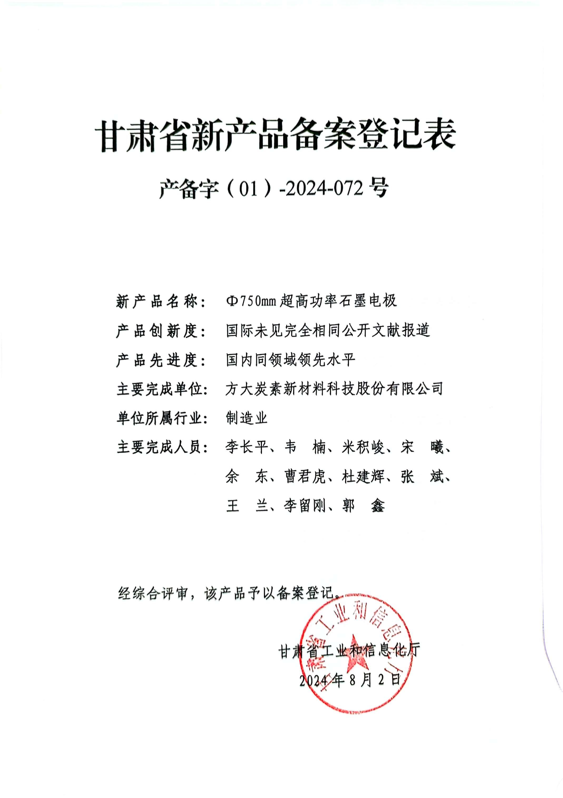 方大炭素φ750mm超高功率石墨电极获甘肃省新产品认证