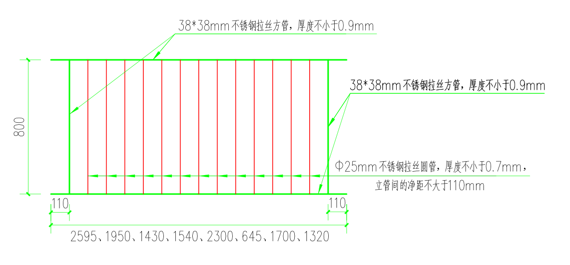 2.方大炭素大酒店四层至十层走廊及消防电梯前室窗户栏杆制作安装。栏杆高度为800mm,长度2595mm、1950mm各为14个,长度1430mm、1540mm、2300mm、645mm各为7个,长度1700mm为13个,长度1320mm为1个,共计70个窗户栏杆。窗户栏杆均安装在窗户两侧墙内侧,安装高度为栏杆下边缘距离窗台板顶面100mm。栏杆制作前由承包人现场测量尺寸后制作安装。